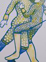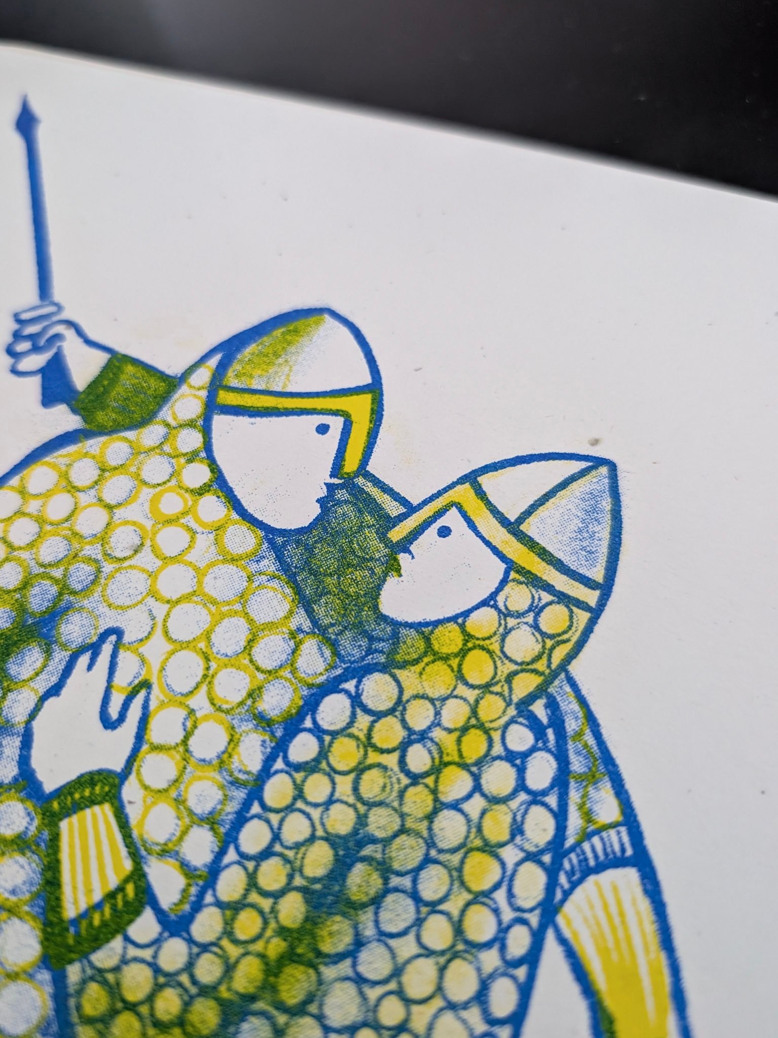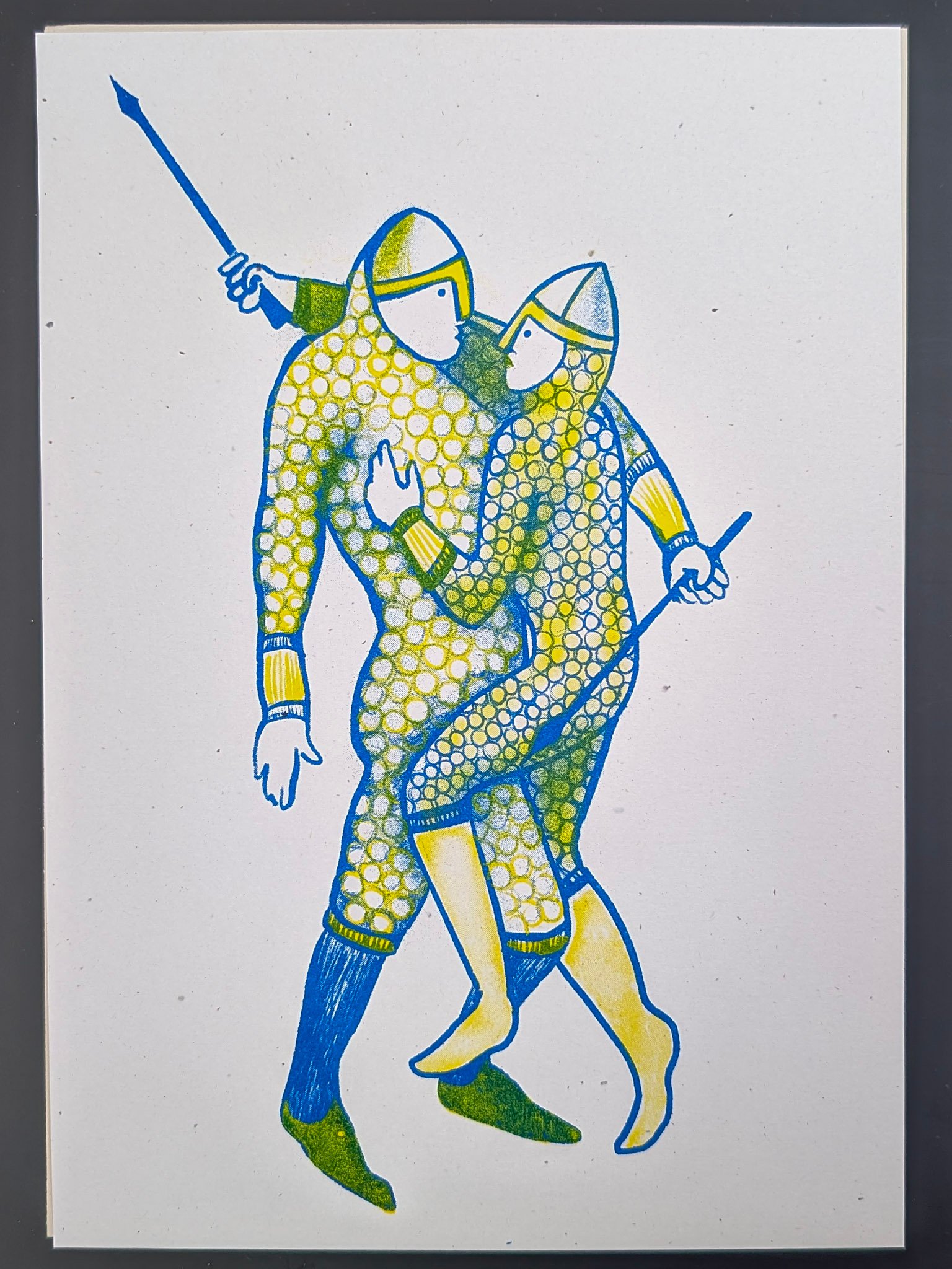 A two-colour risograph print inspired by figures from the Bayeux tapestry.