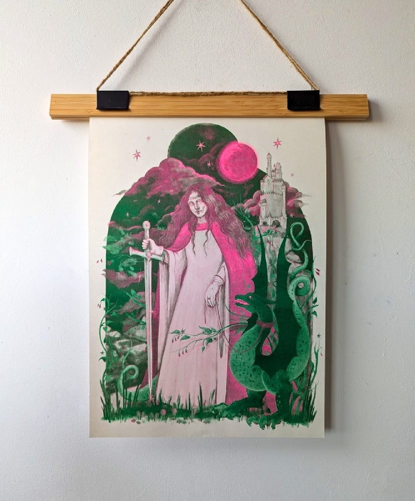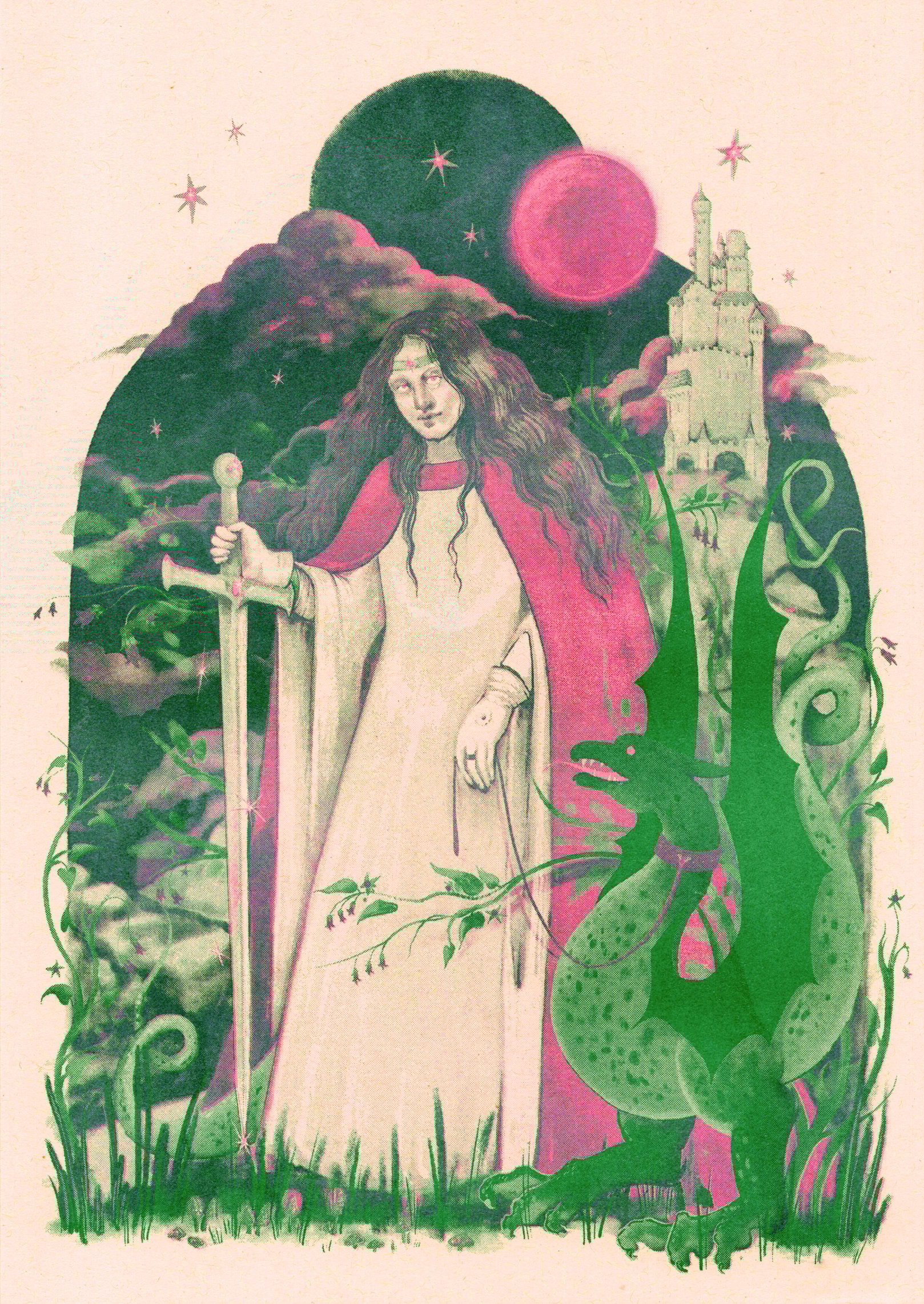 Two-colour risograph print inspired by stories of the princess guarded by the dragons