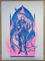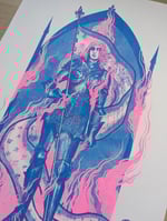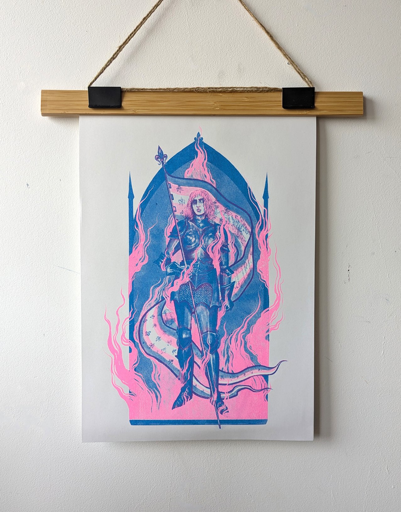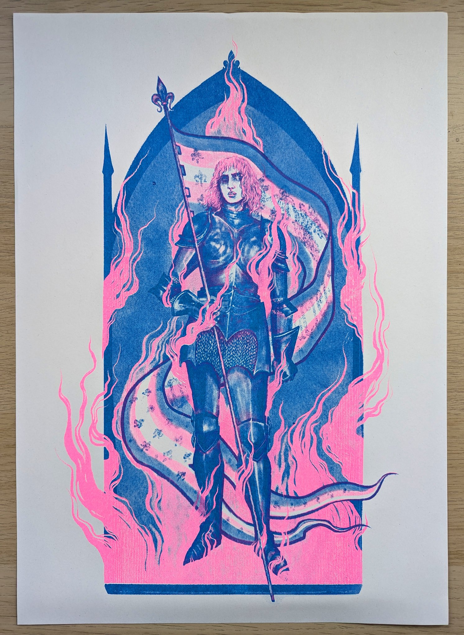 Two-colour risograph print inspired by Joan of Arc, celebrating trans pride.