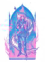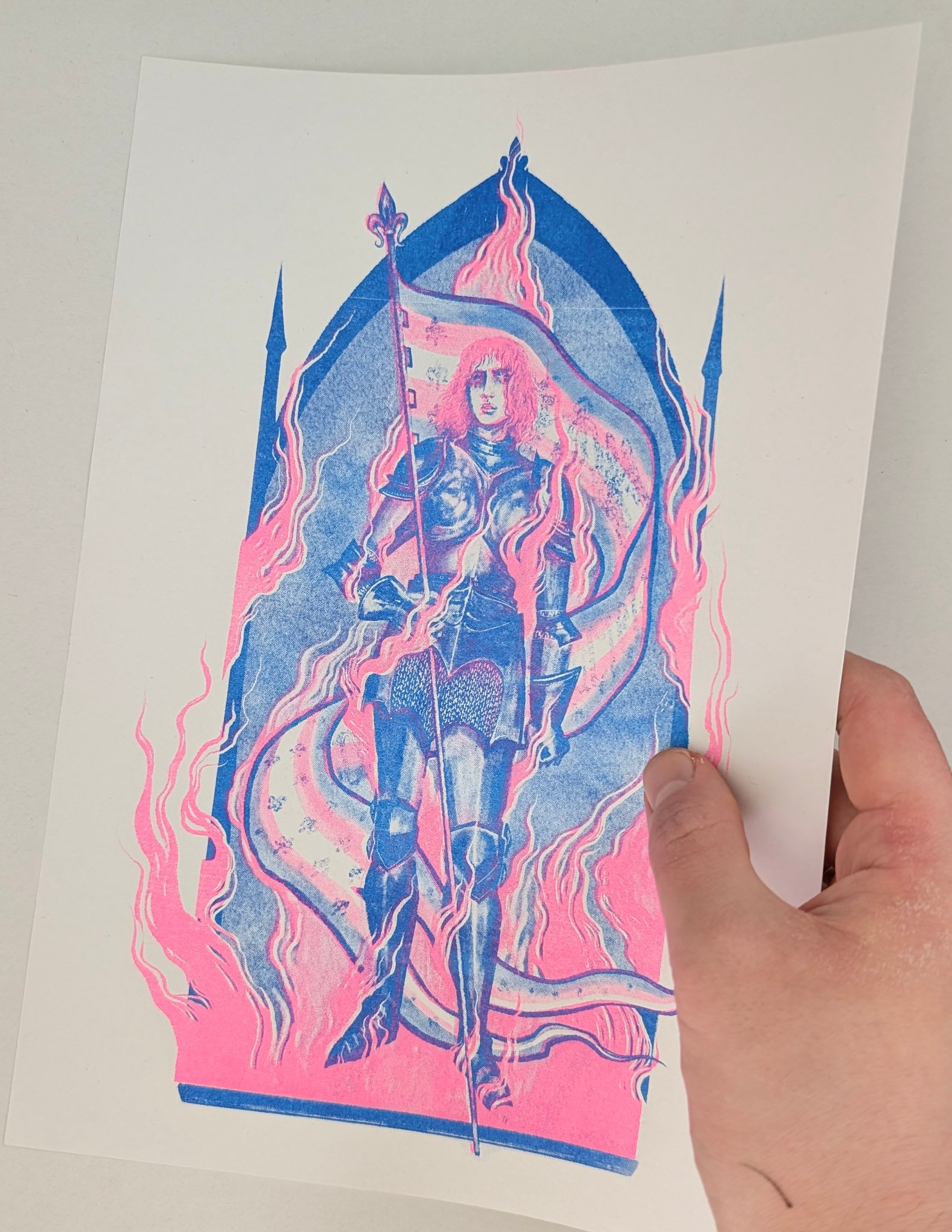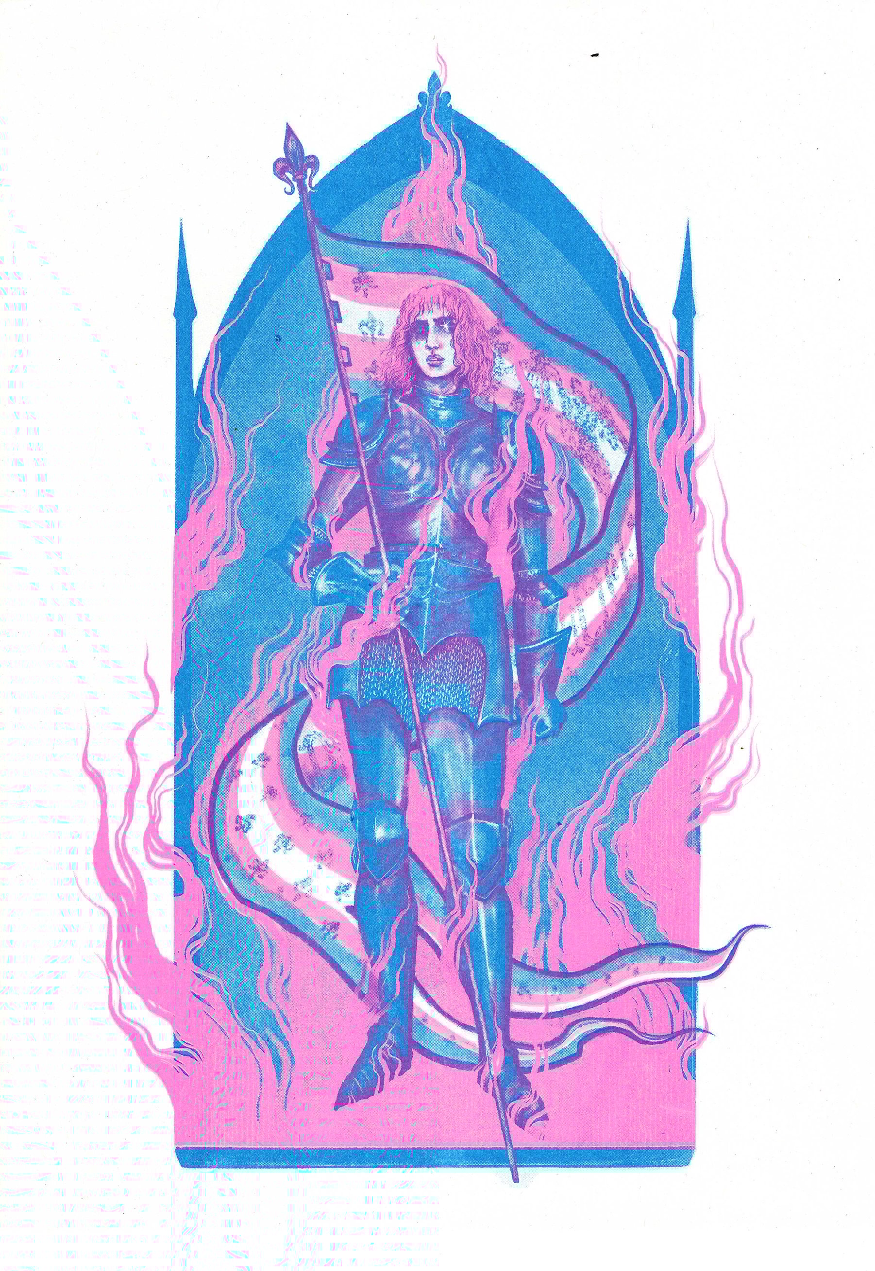 A bold two-colour risograph print inspired by Joan of Arc, celebrating trans pride!