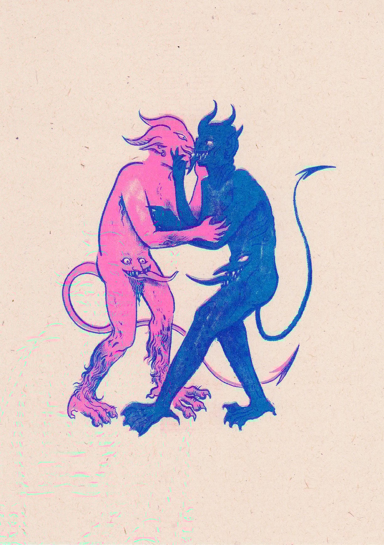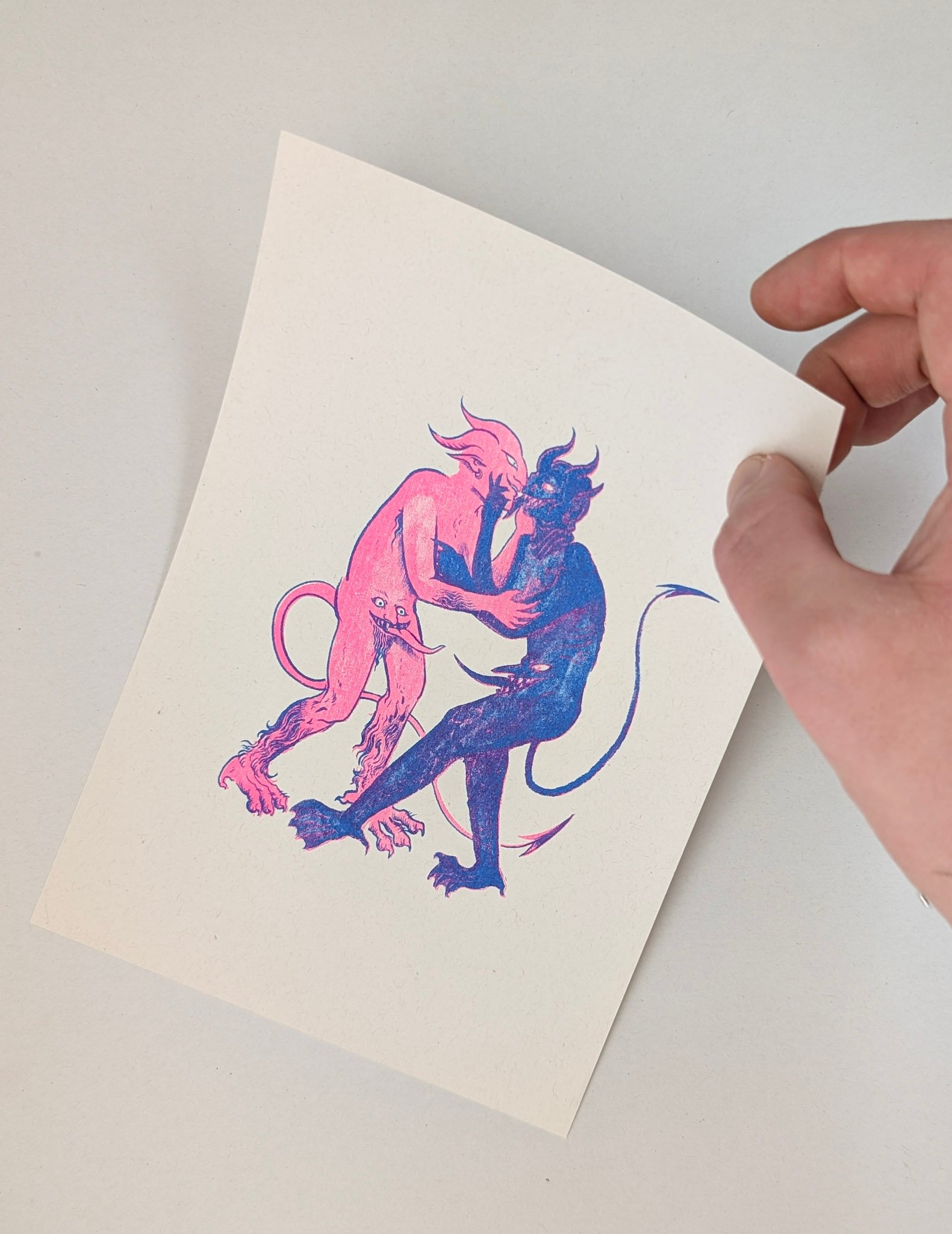 Inks: Fluorescent Pink & Blue on Context Birch recycled paper.