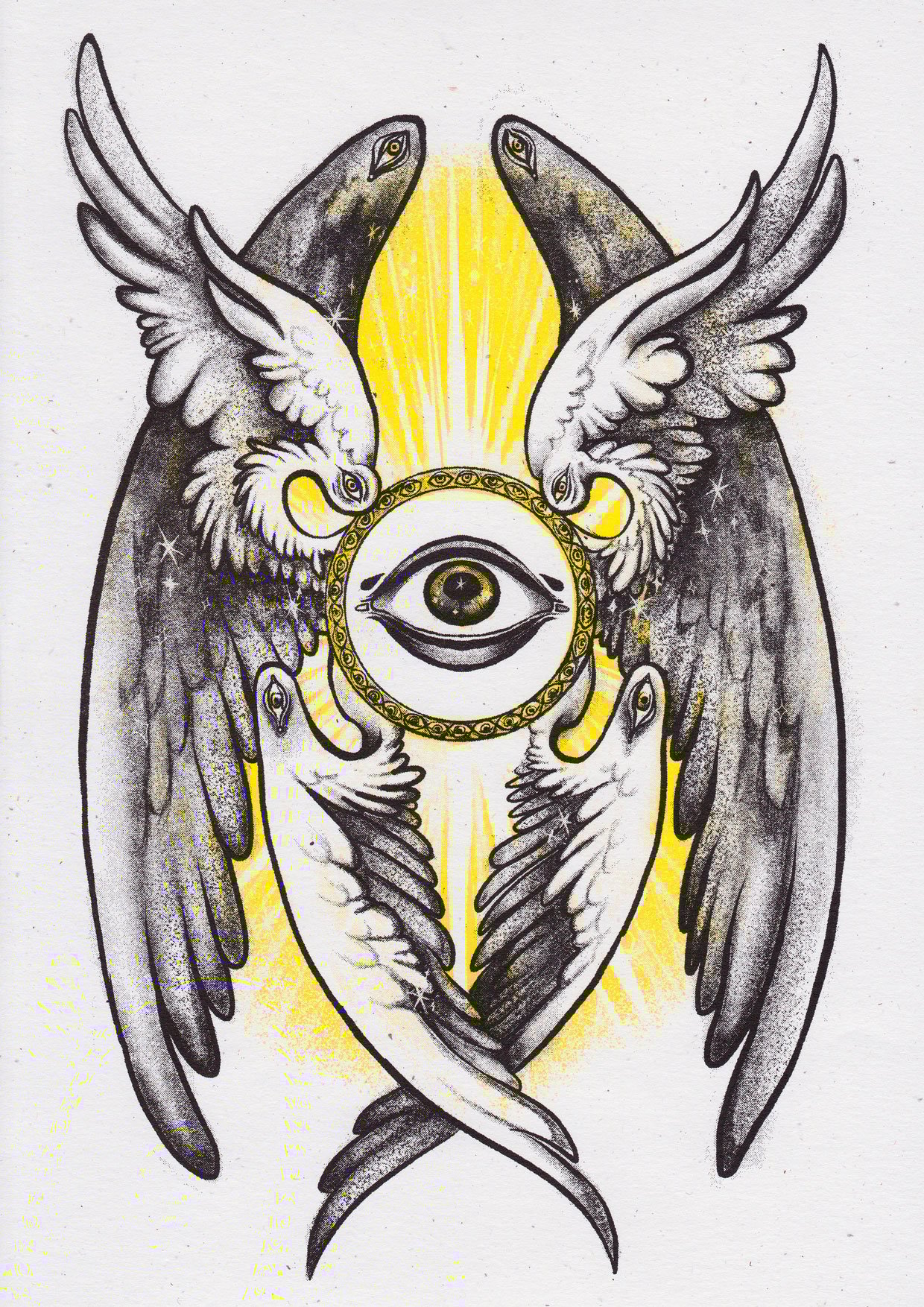 Two-colour risograph print depicting a biblically accurate angel